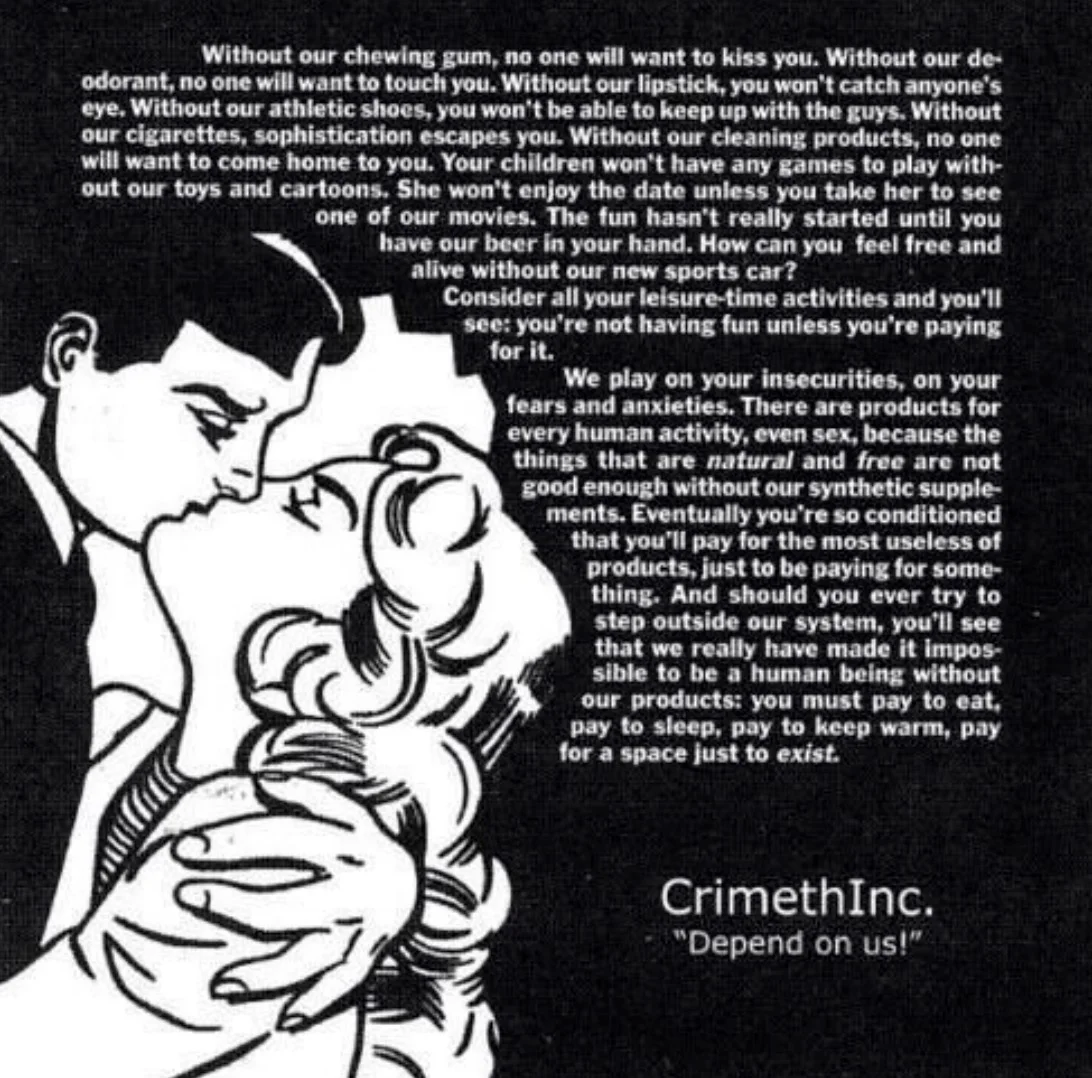 Sex education campaigns, Hollywood movies, romance novels, and advertisements—like the canteen workers in World War I—deployed what has been called, in other contexts, “parasexuality”—a dynamic in which a person (or persons) commands the sexual desire of many without reciprocating that desire. And this parasexuality has persisted in our culture ever since, even surviving so-called “sexual revolutions.” The way we attract sexual attention has tended to model itself on the way we sell products: BLAST your alluring image at a crowd, and filter whatever swims into your net until you land a buyer you want. This is neither a puritan society, with its nervous avoidance of stimulation, nor a liberated society, where we all share in abundance. It is, in some ways, the worst of both worlds: the taunt of abundance and the lived experience of scarcity.